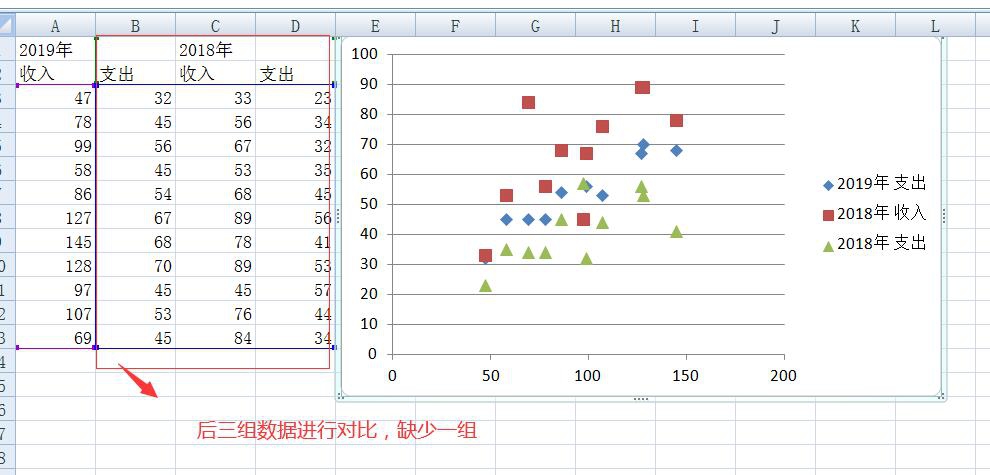 小编用excel先后制作了散点图气泡图,但是有意思的发现散点图,在实现多组数据对比的时候就会出现问题,它不会智能的选择出我们需要的数据,所有就会出现错误。