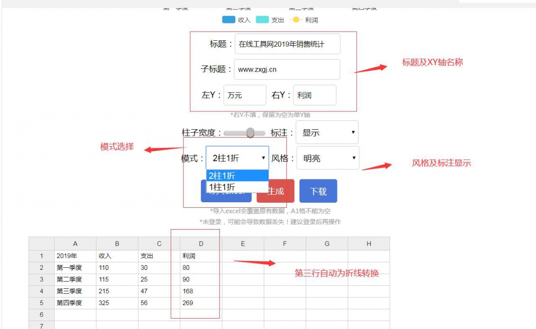 最重要的是操作方便,比如我们需要第四行我们需要做成折线,只需要将模式选择到2柱1折,就会自动帮助我们将第四行的利润变成折线显示,如何我们只有2列数据,那么就选择1柱1折就可以直接选择点击生成就可以了,不需要在各种找各种选了,可以快速将你的表格制作成你想要的图表。是不是很方便,喜欢的朋友赶紧收藏起来备用吧。